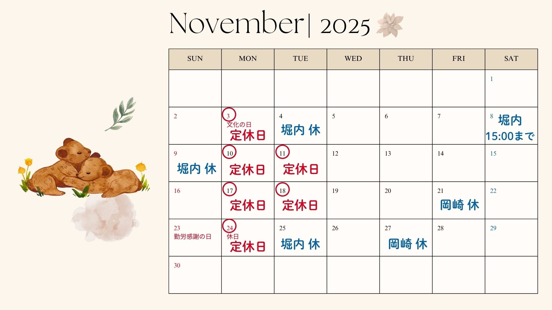 11月の営業日程などのお知らせです。