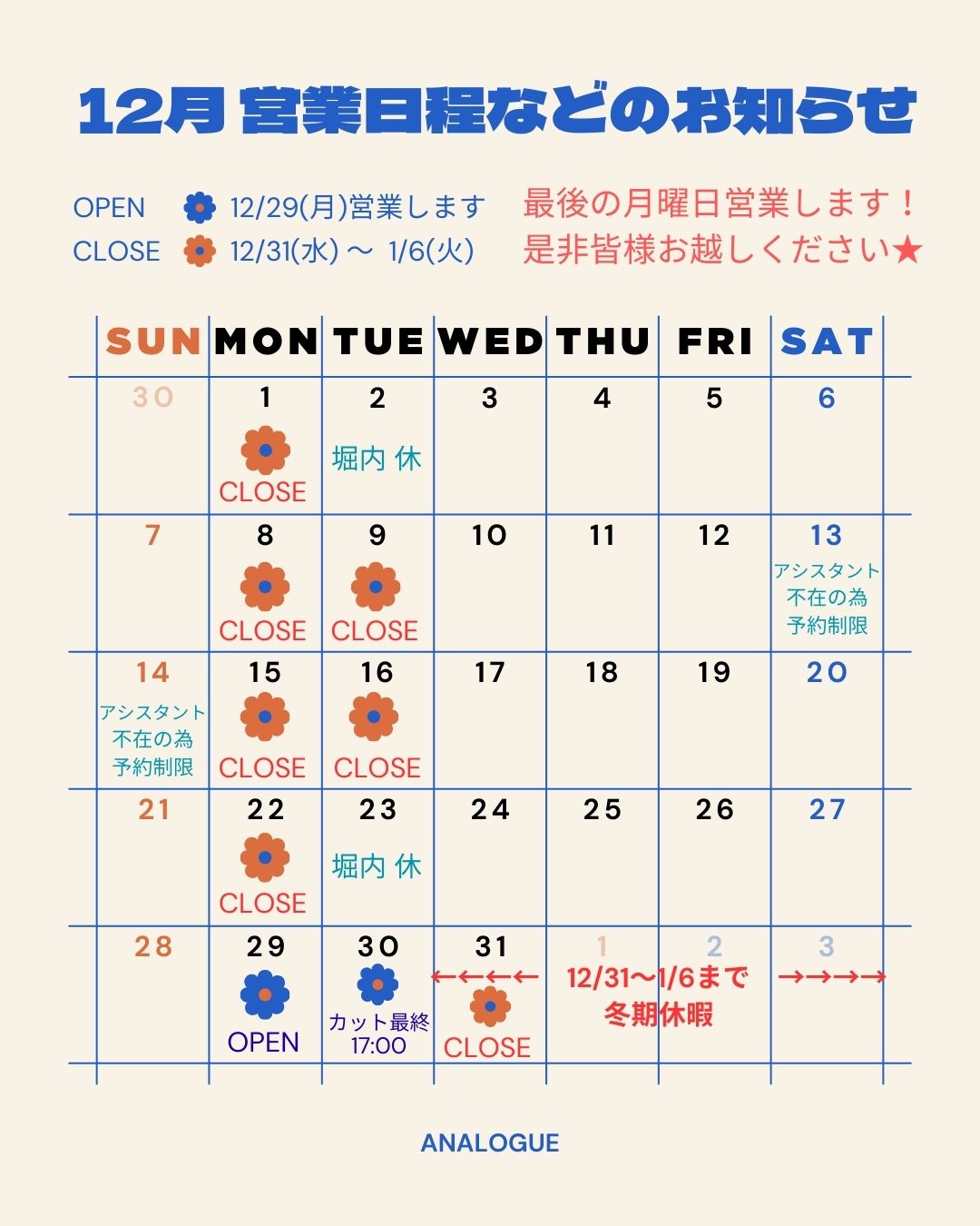 12月は混雑が予想されますので、お早目のご予約をお願い致します。キャンセルや日にち変更も極力お控えいただきます様、ご協力をお願いします。