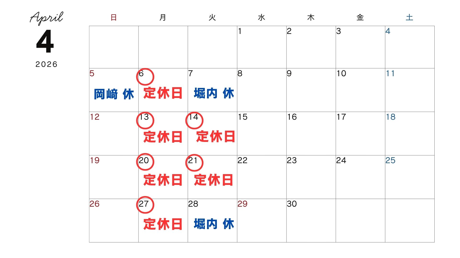 現在アシスタントが怪我の為堀内と岡﨑の二人体制での営業となっております(火曜は岡﨑一人営業です)ご予約時間をおひとり様ずつに制限させていただいてますので予約枠が埋まりやすくなっております。大変ご不便ご迷惑をおかけしますが、ご理解ご協力をお願いします。